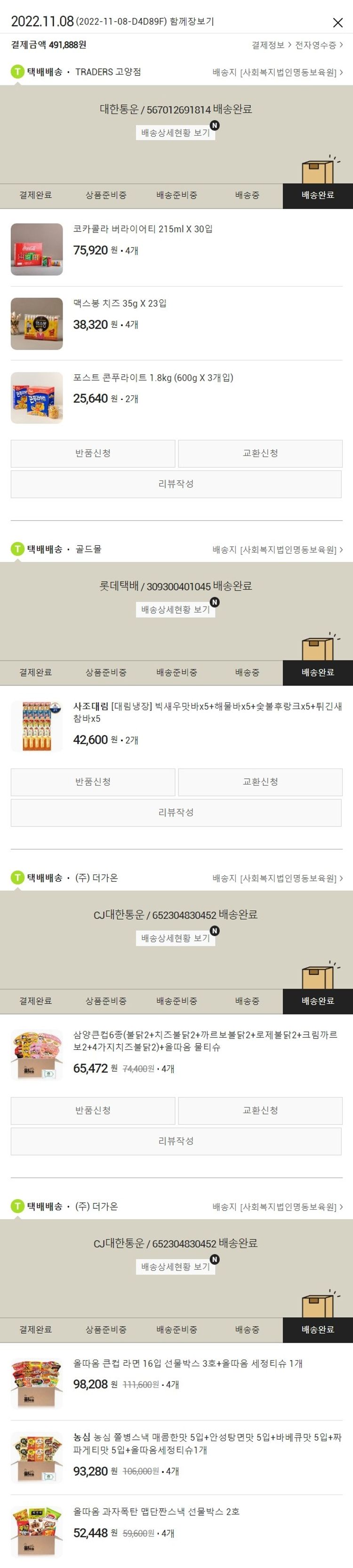 가격상승분 2,280원, 100원 미만 지원금 8원, 결제 수수료 9,155원, 기타 사업비는 행복나눔재단이 부담했습니다. (기부후기 발송시점에 최종 업데이트 됩니다.) 실제 쇼핑몰에서 확인되는 배송현황을 캡처한 내용입니다. 실시간 자료와는 차이가 있을 수 있습니다.