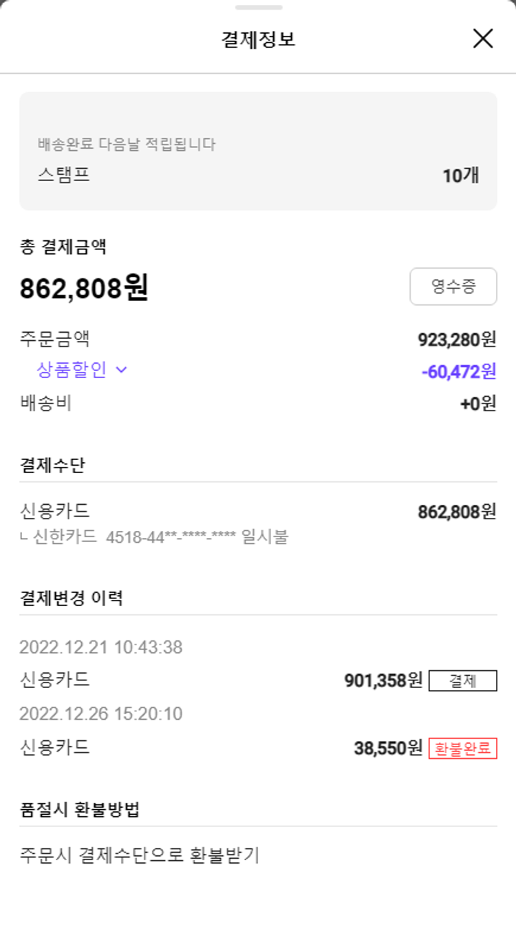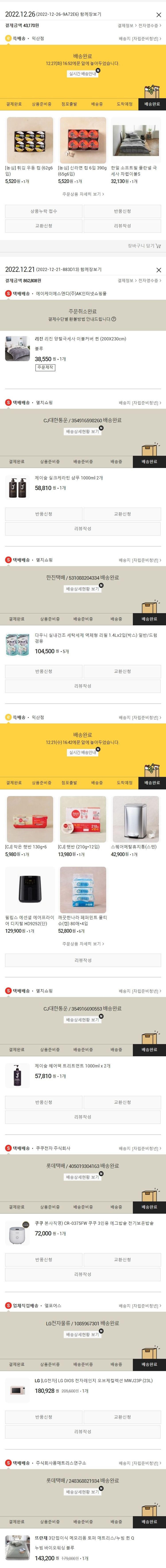 가격상승분 5,918원, 100원 미만 지원금 60원, 기타 사업비는 행복나눔재단이 부담했습니다. (기부후기 발송시점에 최종 업데이트 됩니다.) 주문완료 건 중 품절건이 발생하여 2022.12.26. 대체물품 또는 유사물품으로 재주문하였습니다. 실제 쇼핑몰에서 확인되는 배송현황을 캡처한 내용입니다. 실시간 자료와는 차이가 있을 수 있습니다.