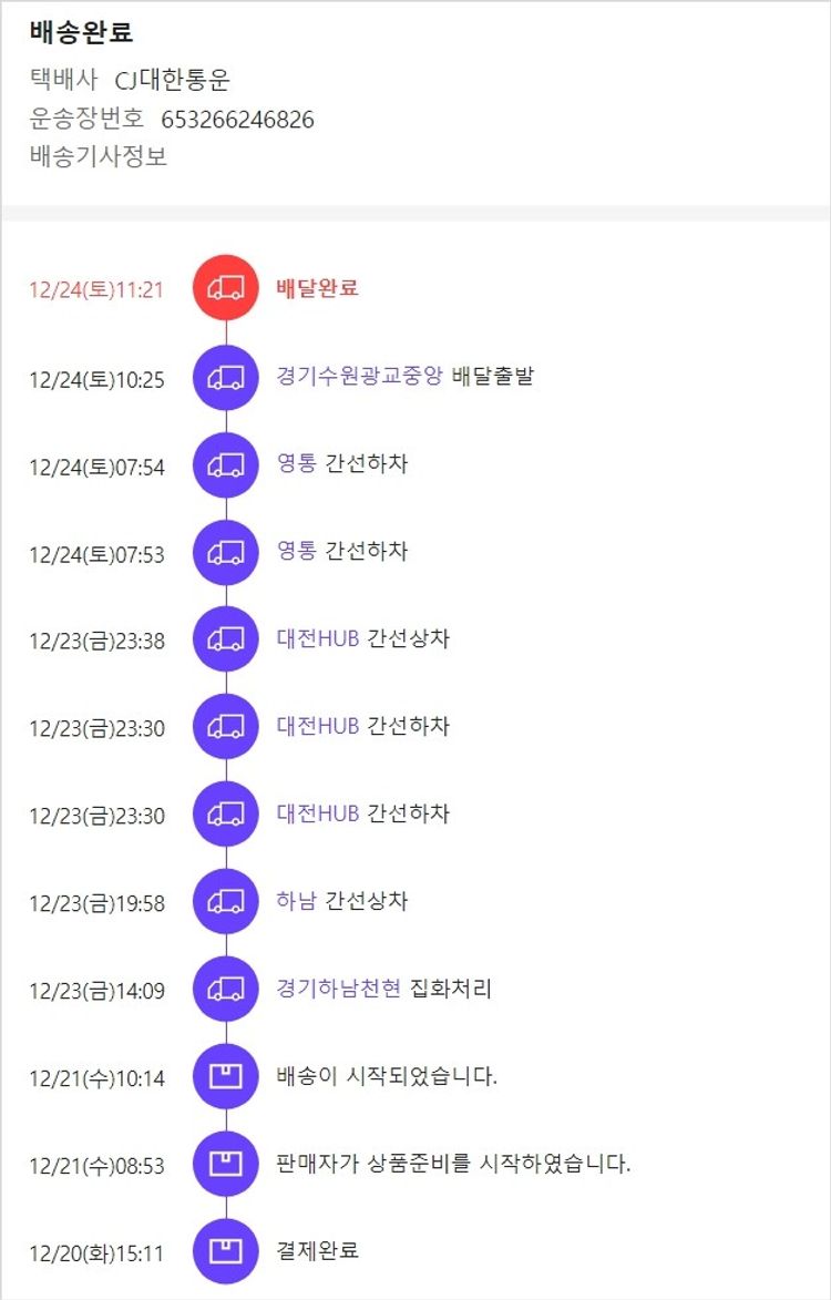 기부자님이 사용한 기부포인트 25,000원, 가격상승분 8,800원, 100원 미만 지원금 56원, 결제 수수료 9,788원, 기타 사업비는 행복나눔재단이 부담했습니다. (기부후기 발송시점에 최종 업데이트 됩니다.) 실제 쇼핑몰에서 확인되는 배송현황을 캡처한 내용입니다. 실시간 자료와는 차이가 있을 수 있습니다.