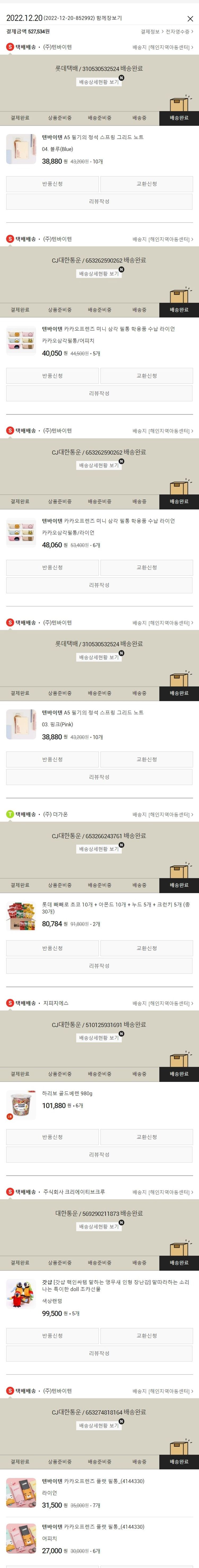 기부자님이 사용한 기부포인트 9,100원, 물품배송비 21,000원, 가격상승분 5,790원, 100원 미만 지원금 44원, 결제 수수료 10,972원, 기타 사업비는 행복나눔재단이 부담했습니다. (기부후기 발송시점에 최종 업데이트 됩니다.) 실제 쇼핑몰에서 확인되는 배송현황을 캡처한 내용입니다. 실시간 자료와는 차이가 있을 수 있습니다.