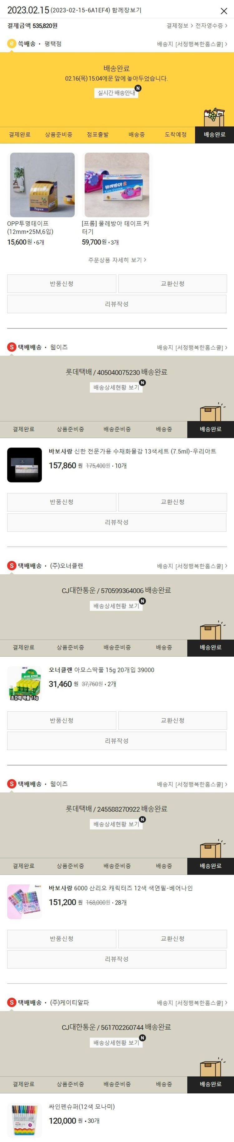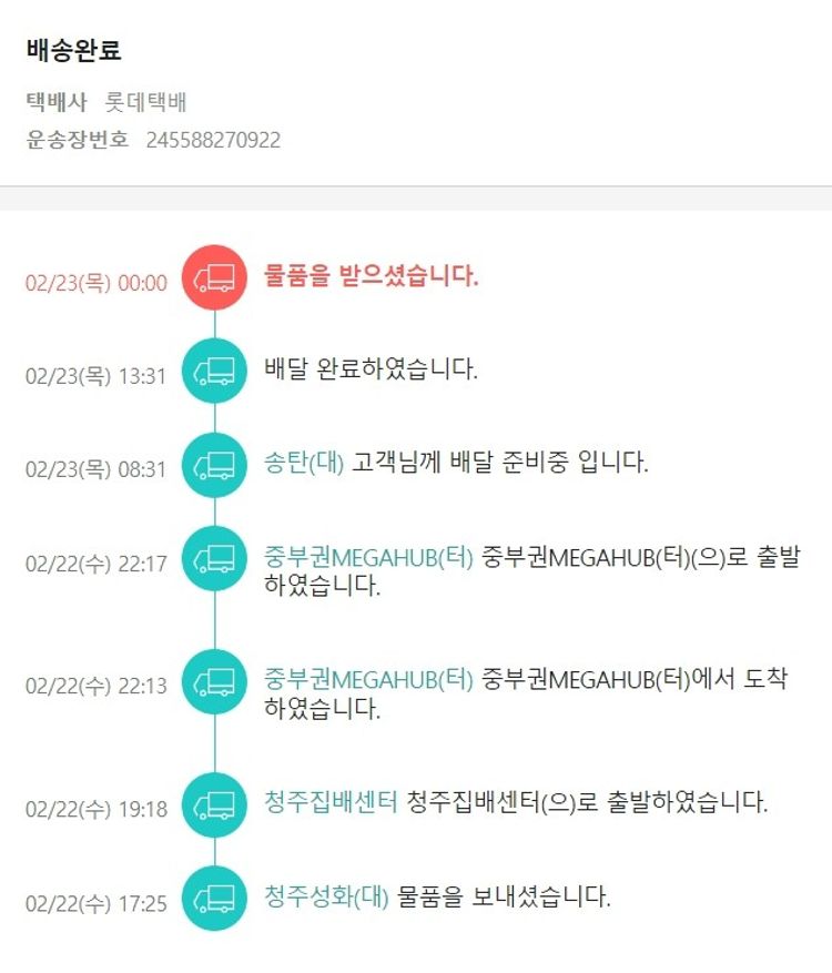 기부자님이 사용한 기부포인트 49,800원, 가격상승분 1,920원, 결제 수수료 11,769원, 기타 사업비는 행복나눔재단이 부담했습니다. (기부후기 발송시점에 최종 업데이트 됩니다.) 실제 쇼핑몰에서 확인되는 배송현황을 캡처한 내용입니다. 실시간 자료와는 차이가 있을 수 있습니다.
