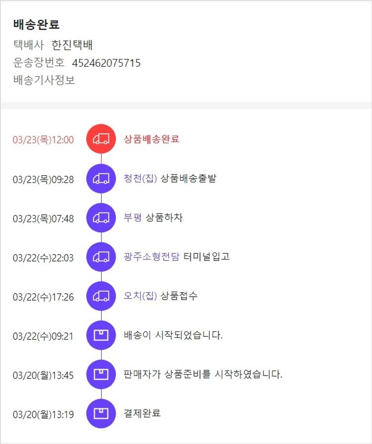 물품배송비 8,900원, 가격상승분 420원, 100원 미만 지원금 66원, 결제 수수료 12,694원, 기타 사업비는 행복나눔재단이 부담했습니다. (기부후기 발송시점에 최종 업데이트 됩니다.) 주문 건 중 품절 건 발생하여 2023. 03. 20. 재주문하였습니다. 실제 쇼핑몰에서 확인되는 배송현황을 캡처한 내용입니다. 실시간 자료와는 차이가 있을 수 있습니다.