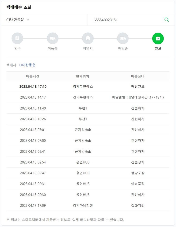 기부자님이 사용한 기부포인트 12,100원, 물품배송비 3,000원, 가격상승분 3,584원, 100원 미만 지원금 20원, 결제 수수료 14,474원, 기타 사업비는 행복나눔재단이 부담했습니다. (기부후기 발송시점에 최종 업데이트 됩니다.) 주문 건 중 품절 건 발생하여 2023. 04. 14. 재주문하였습니다. 실제 쇼핑몰에서 확인되는 배송현황을 캡처한 내용입니다. 실시간 자료와는 차이가 있을 수 있습니다.