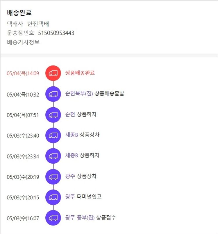 실제 쇼핑몰에서 확인되는 배송현황을 캡처한 내용입니다. 실시간 자료와는 차이가 있을 수 있습니다.