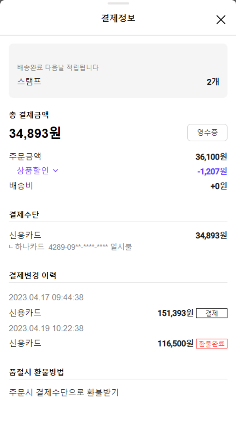 주문 건 중 품절 건 발생하여 2023. 04. 19. 재주문하였습니다.