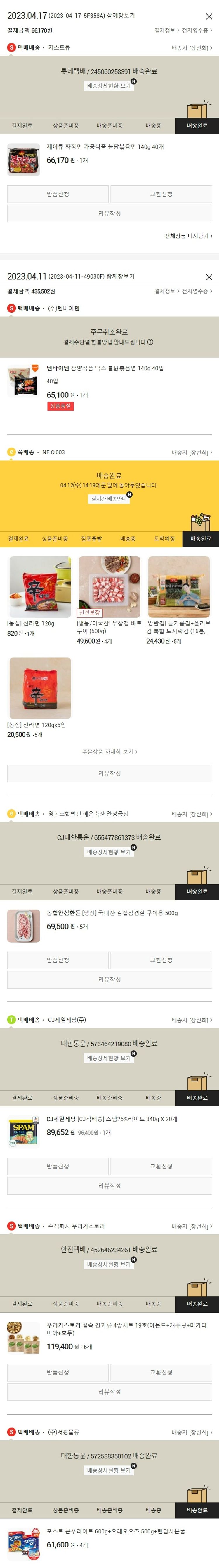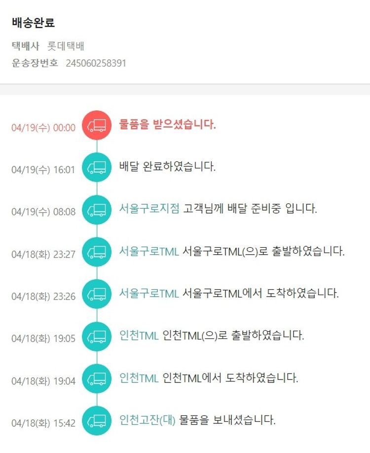 가격상승분 1,575원, 100원 미만 지원금 97원, 결제 수수료 9,350원, 기타 사업비는 행복나눔재단이 부담했습니다. (기부후기 발송시점에 최종 업데이트 됩니다.) 주문 건 중 품절 건 발생하여 2023. 04. 17. 재주문하였습니다. 실제 쇼핑몰에서 확인되는 배송현황을 캡처한 내용입니다. 실시간 자료와는 차이가 있을 수 있습니다.