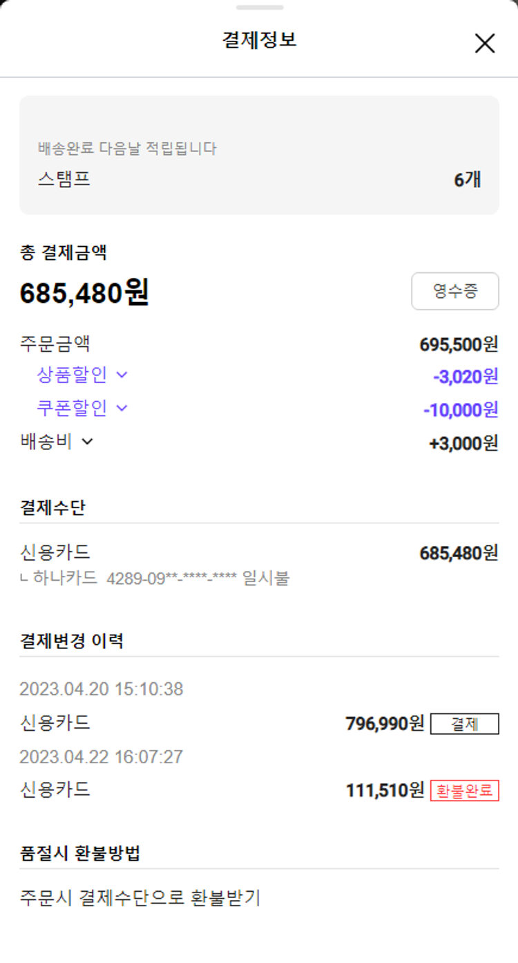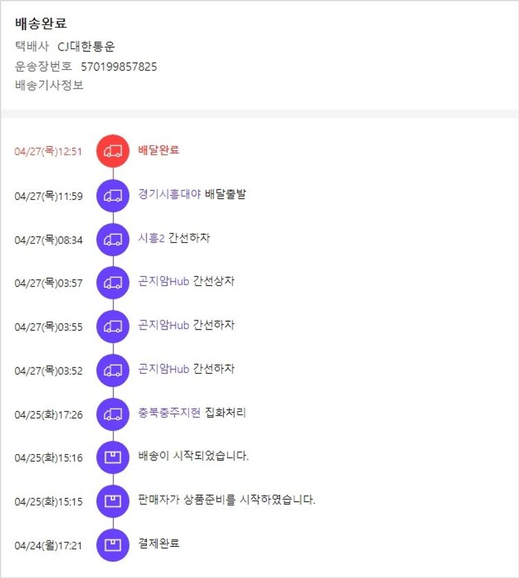 기부자님이 사용한 기부포인트 57,000원, 물품배송비 6,000원, 가격상승분 1,580원, 결제 수수료 15,655원, 기타 사업비는 행복나눔재단이 부담했습니다. (기부후기 발송시점에 최종 업데이트 됩니다.) 주문 건 중 품절 건 발생하여 2023. 04. 24. 센터와 상의 후 강아지 장난감 공으로 재주문하였습니다. 실제 쇼핑몰에서 확인되는 배송현황을 캡처한 내용입니다. 실시간 자료와는 차이가 있을 수 있습니다.