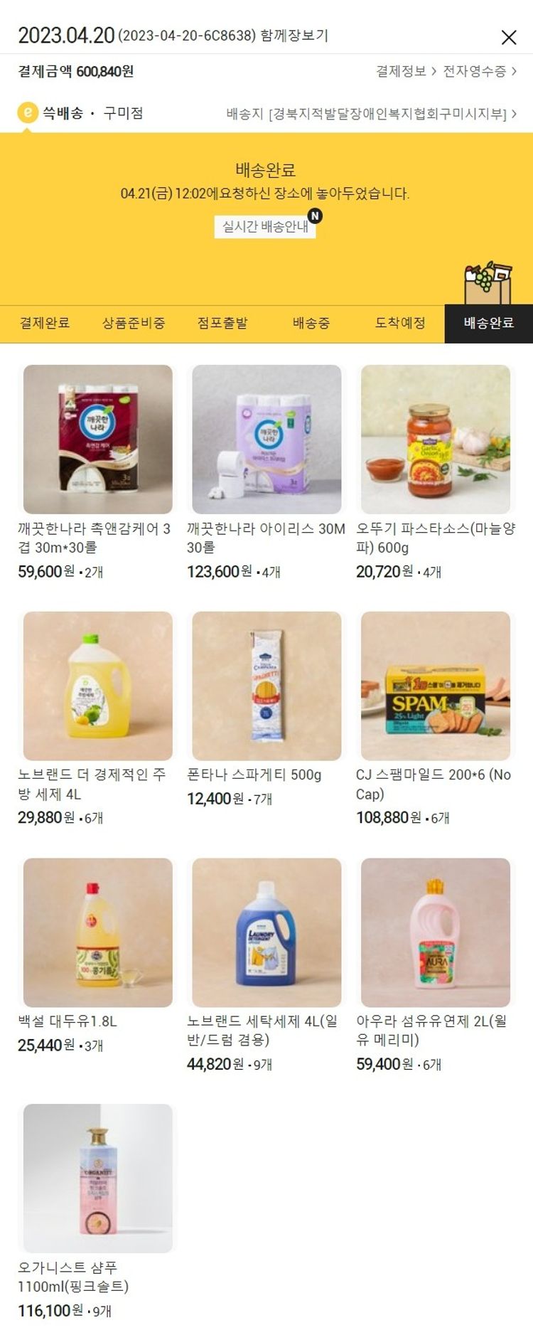 기부자님이 사용한 기부포인트 23,000원, 가격상승분 1,640원, 결제 수수료 11,201원, 기타 사업비는 행복나눔재단이 부담했습니다. (기부후기 발송시점에 최종 업데이트 됩니다.) 실제 쇼핑몰에서 확인되는 배송현황을 캡처한 내용입니다. 실시간 자료와는 차이가 있을 수 있습니다.