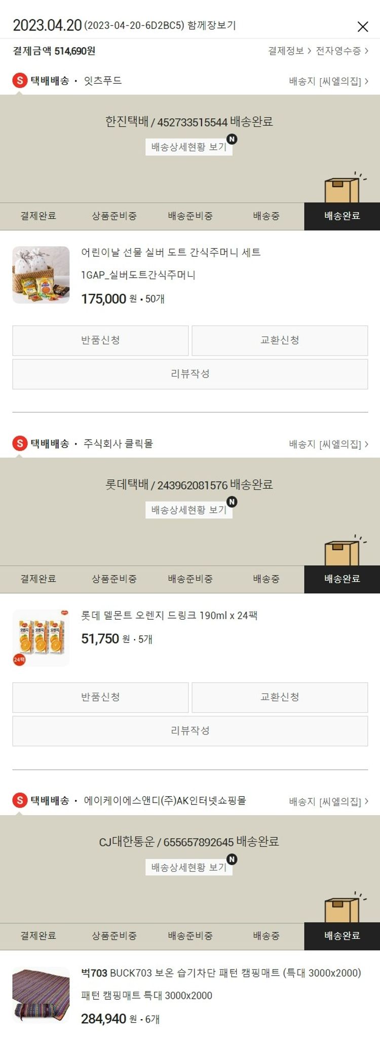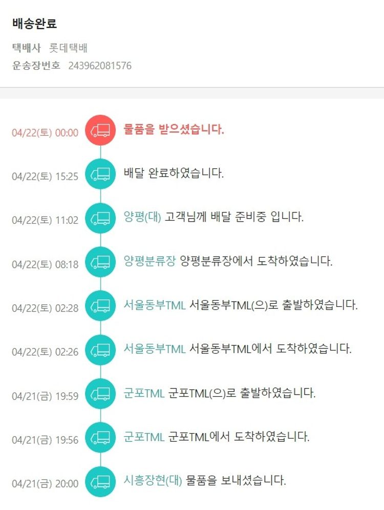 기부자님이 사용한 기부포인트 36,650원, 물품배송비 3,000원, 100원 미만 지원금 90원, 결제 수수료 14,213원, 기타 사업비는 행복나눔재단이 부담했습니다. (기부후기 발송시점에 최종 업데이트 됩니다.) 실제 쇼핑몰에서 확인되는 배송현황을 캡처한 내용입니다. 실시간 자료와는 차이가 있을 수 있습니다.
