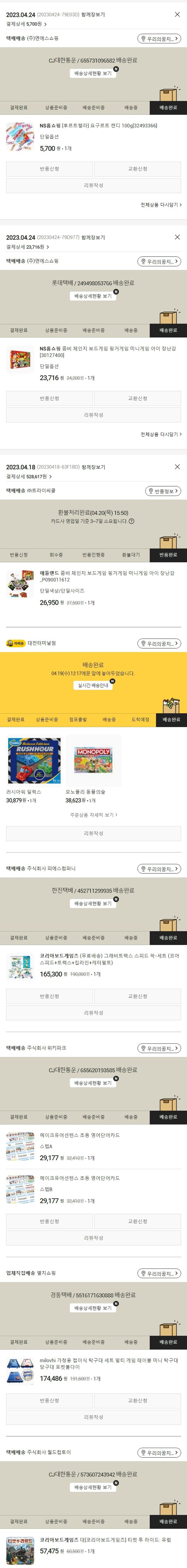 기부자님이 사용한 기부포인트 19,000원, 물품배송비 3,500원, 가격상승분 2,559원, 100원 미만 지원금 74원, 결제 수수료 13,578원, 기타 사업비는 행복나눔재단이 부담했습니다. (기부후기 발송시점에 최종 업데이트 됩니다.) 주문 건 중 품절 건 발생하여 2023. 04. 24. 재주문하였습니다. 실제 쇼핑몰에서 확인되는 배송현황을 캡처한 내용입니다. 실시간 자료와는 차이가 있을 수 있습니다.