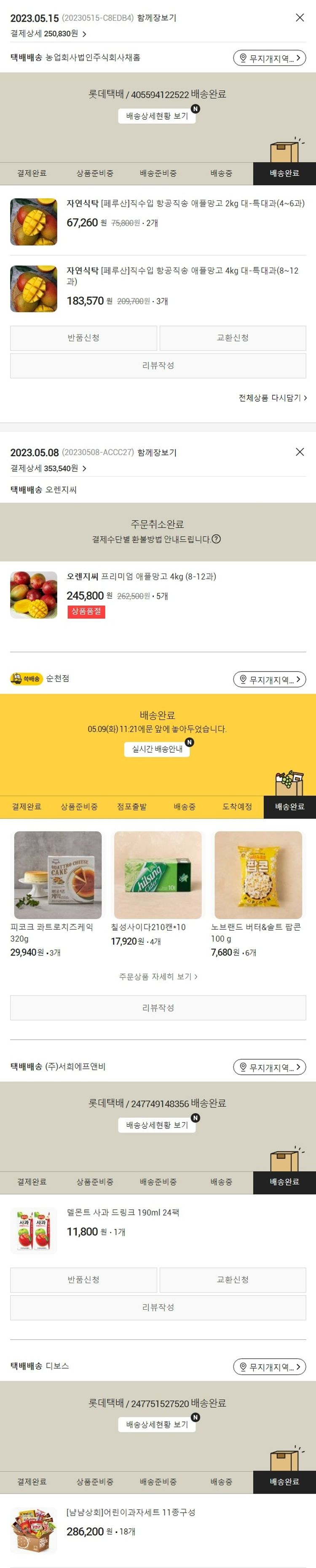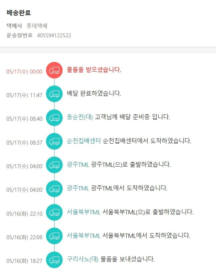 기부자님이 사용한 기부포인트 2,000원, 가격상승분 5,340원, 100원 미만 지원금 30원, 결제 수수료 13,919원, 기타 사업비는 행복나눔재단이 부담했습니다. (기부후기 발송시점에 최종 업데이트 됩니다.) 주문 건 중 품절 건 발생하여 2023. 05. 15. 재주문하였습니다. 실제 쇼핑몰에서 확인되는 배송현황을 캡처한 내용입니다. 실시간 자료와는 차이가 있을 수 있습니다.