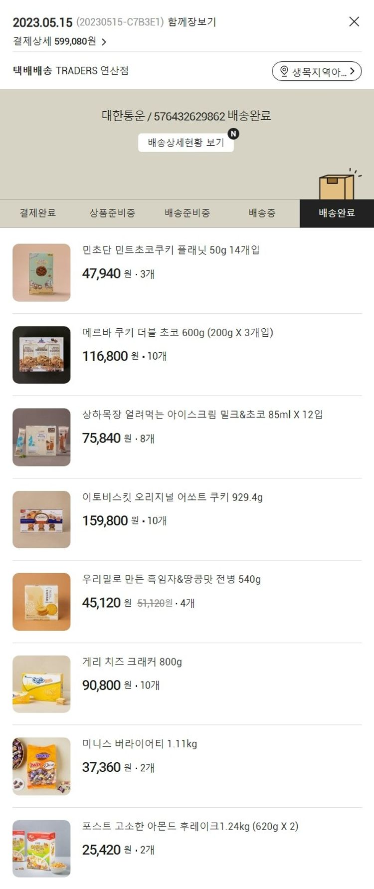 기부자님이 사용한 기부포인트 59,000원, 100원 미만 지원금 80원, 결제 수수료 11,512원, 기타 사업비는 행복나눔재단이 부담했습니다. (기부후기 발송시점에 최종 업데이트 됩니다.) 실제 쇼핑몰에서 확인되는 배송현황을 캡처한 내용입니다. 실시간 자료와는 차이가 있을 수 있습니다.