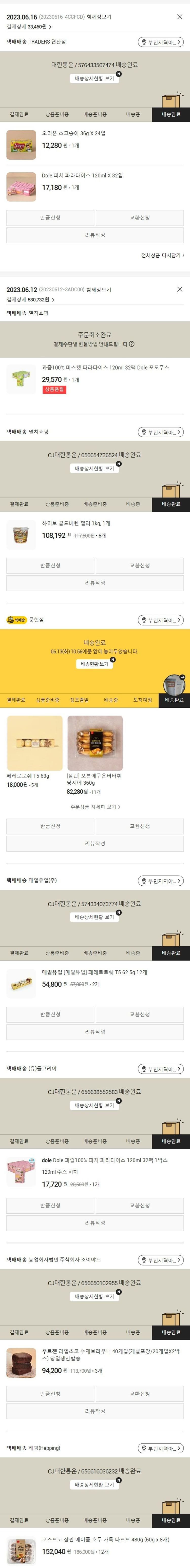 기부자님이 사용한 기부포인트 58,050원, 물품배송비 7,500원, 가격상승분 92원, 결제 수수료 12,278원, 기타 사업비는 행복나눔재단이 부담했습니다. (기부후기 발송시점에 최종 업데이트 됩니다.) 주문 건 중 품절 건 발생하여 2023. 06. 16. 재주문하였습니다. 실제 쇼핑몰에서 확인되는 배송현황을 캡처한 내용입니다. 실시간 자료와는 차이가 있을 수 있습니다.