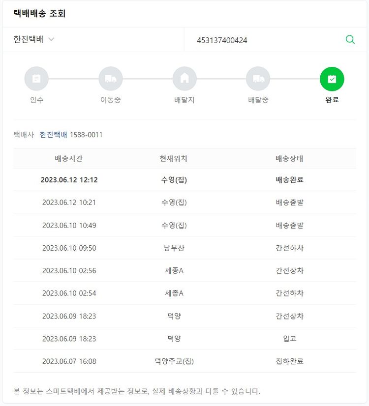 가격상승분 280원, 100원 미만 지원금 70원, 결제 수수료 12,115원, 기타 사업비는 행복나눔재단이 부담했습니다. (기부후기 발송시점에 최종 업데이트 됩니다.) 실제 쇼핑몰에서 확인되는 배송현황을 캡처한 내용입니다. 실시간 자료와는 차이가 있을 수 있습니다.