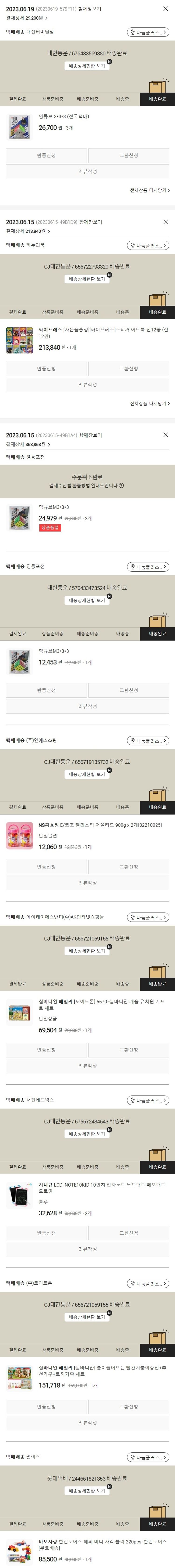 기부자님이 사용한 기부포인트 3,000원, 물품배송비 2,500원, 가격상승분 993원, 100원 미만 지원금 10원, 결제 수수료 14,692원, 기타 사업비는 행복나눔재단이 부담했습니다. (기부후기 발송시점에 최종 업데이트 됩니다.) 주문 건 중 품절 건 발생하여 2023. 06. 19. 재주문하였습니다. 실제 쇼핑몰에서 확인되는 배송현황을 캡처한 내용입니다. 실시간 자료와는 차이가 있을 수 있습니다.