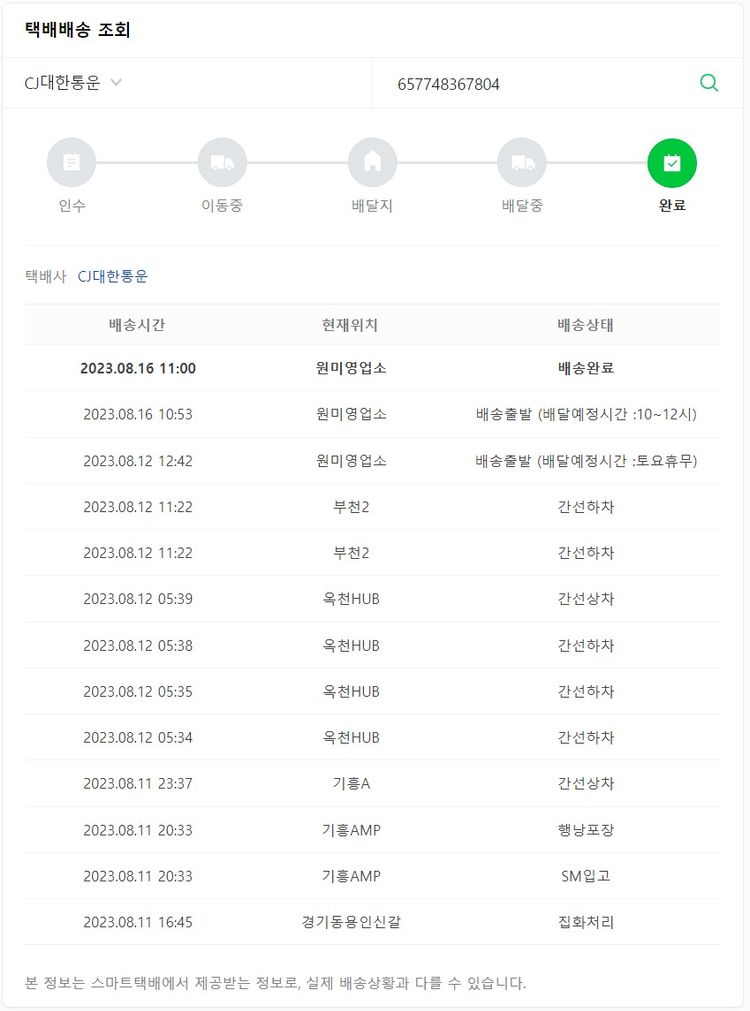 기부자님이 사용한 기부포인트 20,600원, 물품배송비 12,000원, 가격상승분 450원, 100원 미만 지원금 45원, 결제 수수료 14,994원, 기타 사업비는 행복나눔재단이 부담했습니다. (기부후기 발송시점에 최종 업데이트 됩니다.) 주문 건 중 품절 건 발생하여 2023. 08. 10. 재주문했습니다. 실제 쇼핑몰에서 확인되는 배송현황을 캡처한 내용입니다. 실시간 자료와는 차이가 있을 수 있습니다.