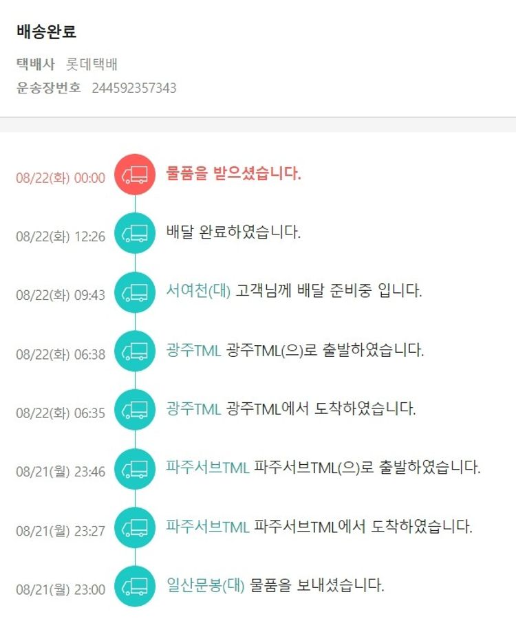 기부자님이 사용한 기부포인트 25,150원, 가격상승분 710원, 100원 미만 지원금 74원, 결제 수수료 14,596원, 기타 사업비는 행복나눔재단이 부담했습니다. (기부후기 발송시점에 최종 업데이트 됩니다.) 주문 건 중 품절 건 발생하여 2023. 08. 21. 재주문했습니다. 실제 쇼핑몰에서 확인되는 배송현황을 캡처한 내용입니다. 실시간 자료와는 차이가 있을 수 있습니다.
