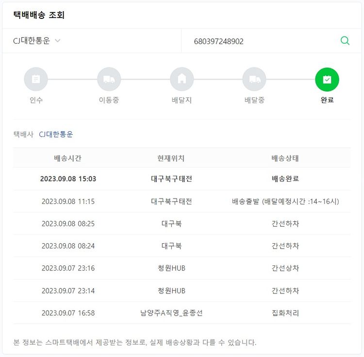 기부자님이 사용한 기부포인트 23,550원, 물품배송비 3,000원, 가격상승분 1,810원, 100원 미만 지원금 20원, 결제 수수료 11,474원, 기타 사업비는 행복나눔재단이 부담했습니다. (기부후기 발송시점에 최종 업데이트 됩니다.) 주문 건 중 품절 건 발생하여 2023. 09. 07. 재주문했습니다. 실제 쇼핑몰에서 확인되는 배송현황을 캡처한 내용입니다. 실시간 자료와는 차이가 있을 수 있습니다.