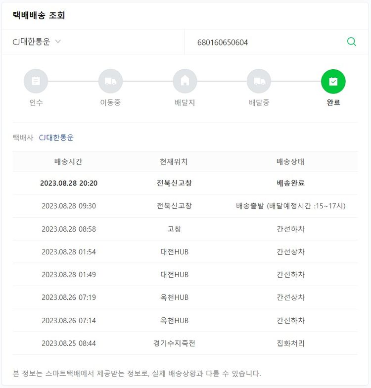 기부자님이 사용한 기부포인트 25,050원, 가격상승분 384원, 100원 미만 지원금 60원, 결제 수수료 23,932원, 기타 사업비는 행복나눔재단이 부담했습니다. (기부후기 발송시점에 최종 업데이트 됩니다.) 실제 쇼핑몰에서 확인되는 배송현황을 캡처한 내용입니다. 실시간 자료와는 차이가 있을 수 있습니다.