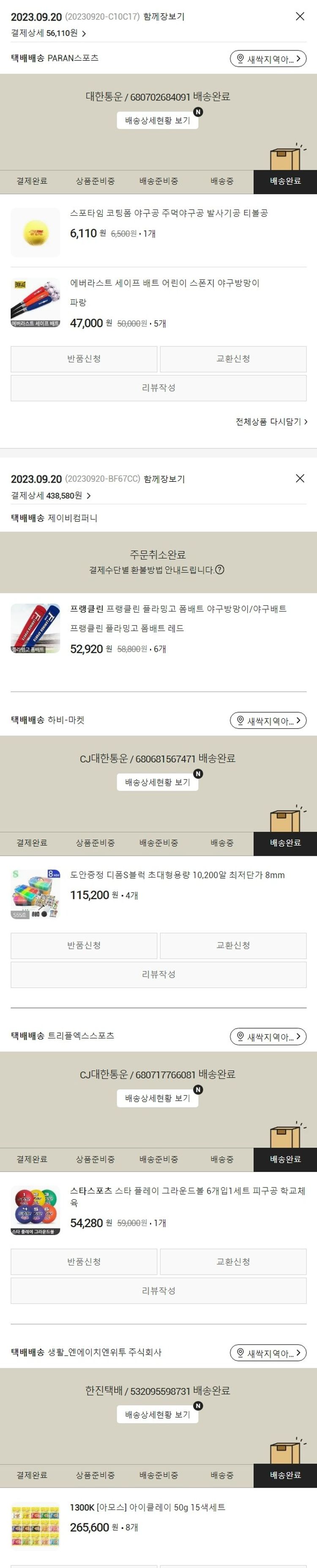 기부자님이 사용한 기부포인트 7,500원, 물품배송비 6,500원, 가격상승분 190원, 결제 수수료 11,800원, 기타 사업비는 행복나눔재단이 부담했습니다. (기부후기 발송시점에 최종 업데이트 됩니다.) 주문 건 중 품절 건 발생하여 2023. 09. 20. 재주문했습니다. 실제 쇼핑몰에서 확인되는 배송현황을 캡처한 내용입니다. 실시간 자료와는 차이가 있을 수 있습니다.