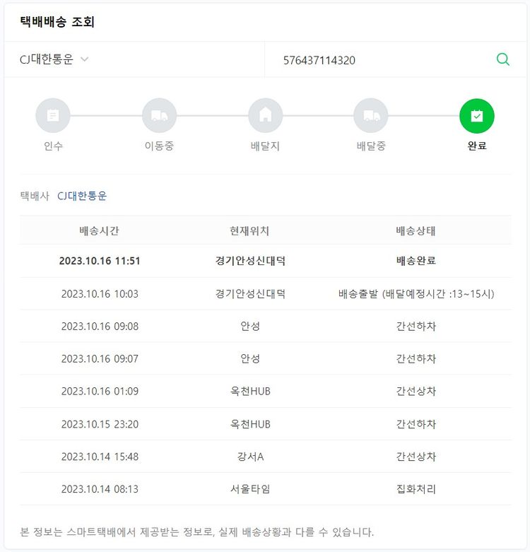 실제 쇼핑몰에서 확인되는 배송현황을 캡처한 내용입니다. 실시간 자료와는 차이가 있을 수 있습니다.