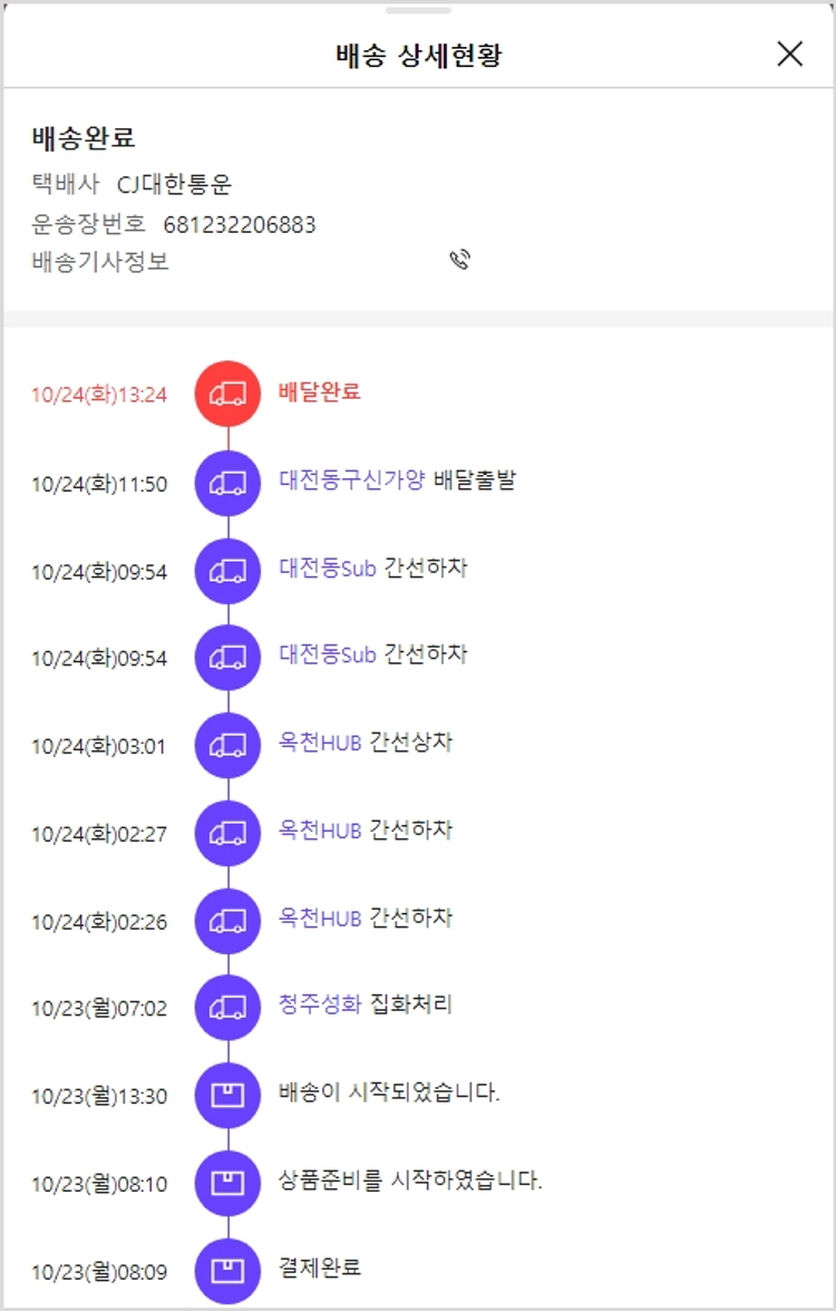 실제 쇼핑몰에서 확인되는 배송현황을 캡처한 내용입니다. 실시간 자료와는 차이가 있을 수 있습니다.