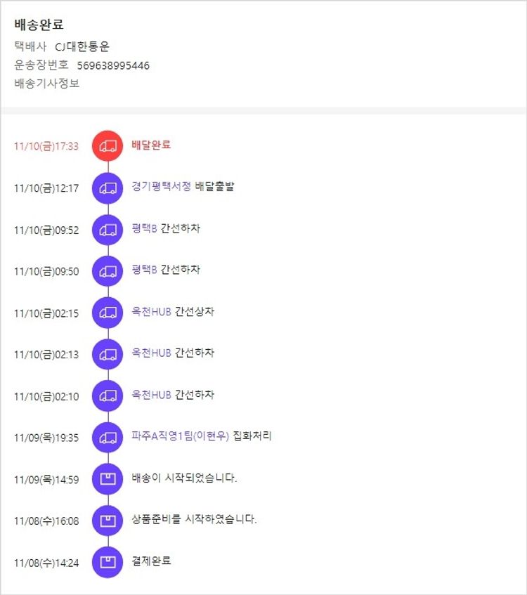 기부자님이 사용한 기부포인트 20,500원, 가격상승분 3,600원, 결제 수수료 10,833원, 기타 사업비는 행복나눔재단이 부담했습니다. (기부후기 발송시점에 최종 업데이트 됩니다.) 실제 쇼핑몰에서 확인되는 배송현황을 캡처한 내용입니다. 실시간 자료와는 차이가 있을 수 있습니다.
