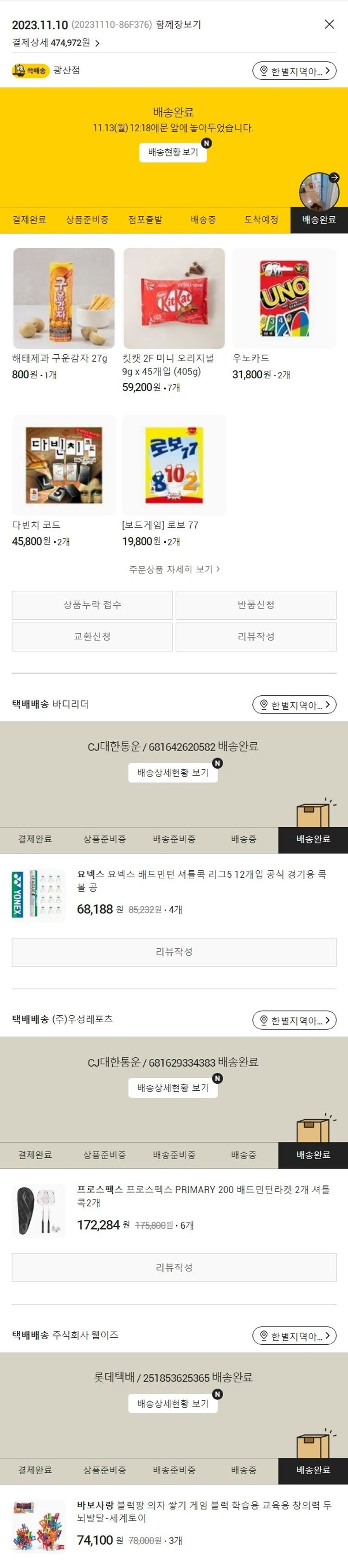 기부자님이 사용한 기부포인트 10,250원, 물품배송비 3,000원, 가격상승분 307원, 100원 미만 지원금 65원, 결제 수수료 11,424원, 기타 사업비는 행복나눔재단이 부담했습니다. (기부후기 발송시점에 최종 업데이트 됩니다.) 실제 쇼핑몰에서 확인되는 배송현황을 캡처한 내용입니다. 실시간 자료와는 차이가 있을 수 있습니다.
