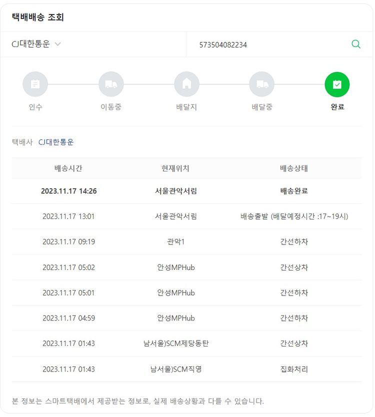 기부자님이 사용한 기부포인트 19,500원, 가격상승분 2,410원, 100원 미만 지원금 40원, 결제 수수료 11,072원, 기타 사업비는 행복나눔재단이 부담했습니다. (기부후기 발송시점에 최종 업데이트 됩니다.) 실제 쇼핑몰에서 확인되는 배송현황을 캡처한 내용입니다. 실시간 자료와는 차이가 있을 수 있습니다.