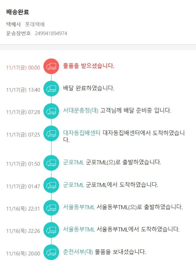 기부자님이 사용한 기부포인트 13,500원, 가격상승분 115원, 100원 미만 지원금 75원, 결제 수수료 13,362원, 기타 사업비는 행복나눔재단이 부담했습니다. (기부후기 발송시점에 최종 업데이트 됩니다.) 실제 쇼핑몰에서 확인되는 배송현황을 캡처한 내용입니다. 실시간 자료와는 차이가 있을 수 있습니다.