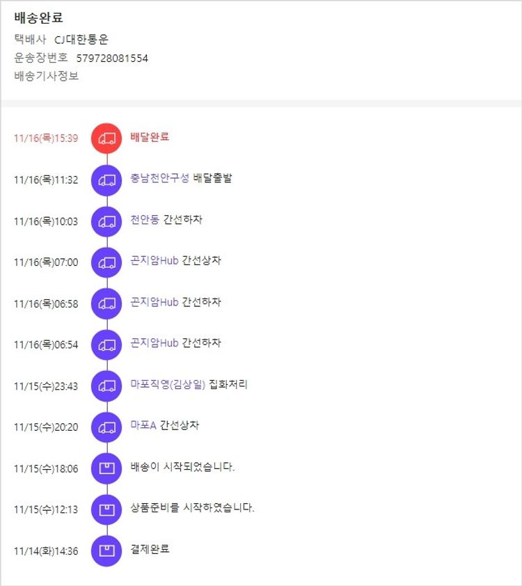 기부자님이 사용한 기부포인트 2,000원, 물품배송비 3,000원, 100원 미만 지원금 16원, 결제 수수료 11,569원, 기타 사업비는 행복나눔재단이 부담했습니다. (기부후기 발송시점에 최종 업데이트 됩니다.) 실제 쇼핑몰에서 확인되는 배송현황을 캡처한 내용입니다. 실시간 자료와는 차이가 있을 수 있습니다.