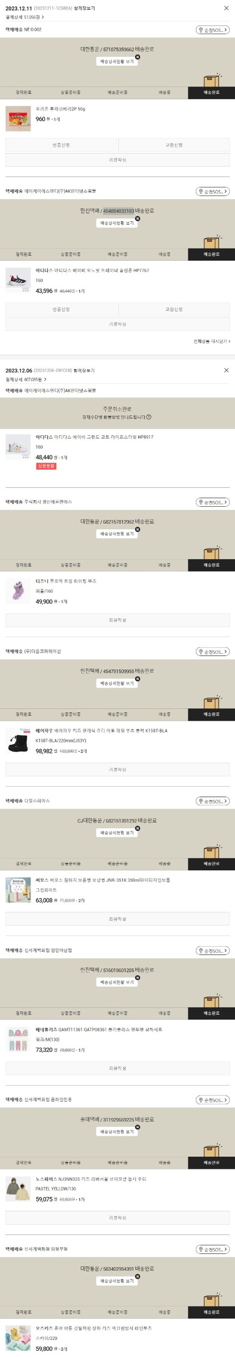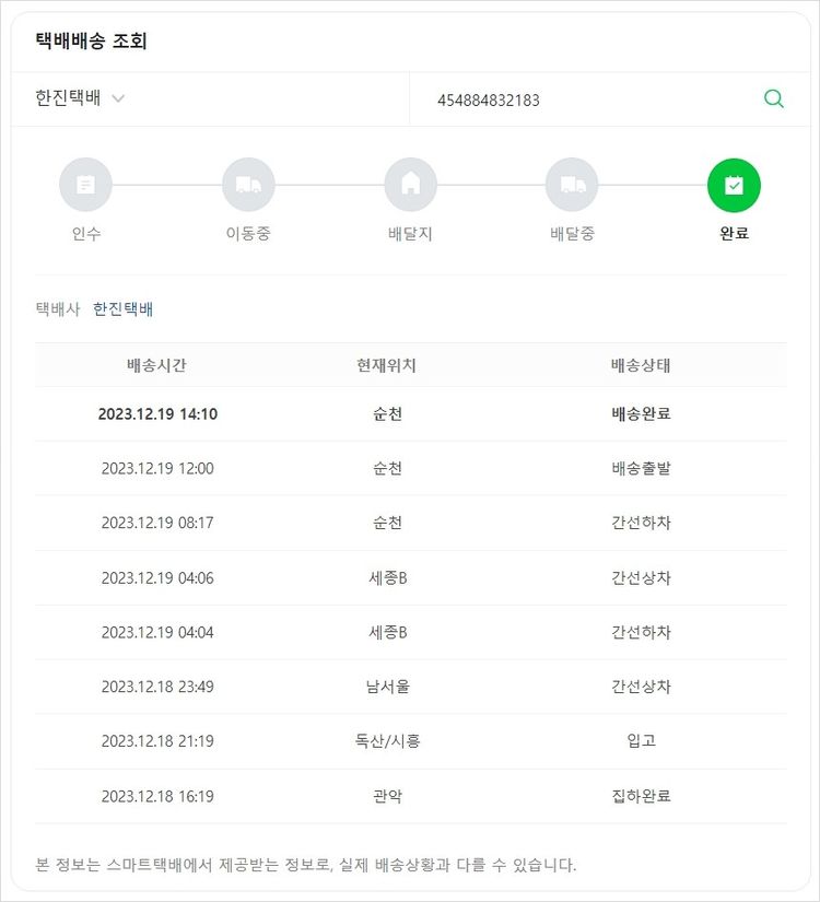 기부자님이 사용한 기부포인트 37,500원, 물품배송비 9,500원, 가격상승분 77원, 100원 미만 지원금 64원, 결제 수수료 9,466원, 기타 사업비는 행복나눔재단이 부담했습니다. (기부후기 발송시점에 최종 업데이트 됩니다.) 주문 건 중 품절 건 발생하여 2023. 12. 11. 재주문했습니다. 실제 쇼핑몰에서 확인되는 배송현황을 캡처한 내용입니다. 실시간 자료와는 차이가 있을 수 있습니다.