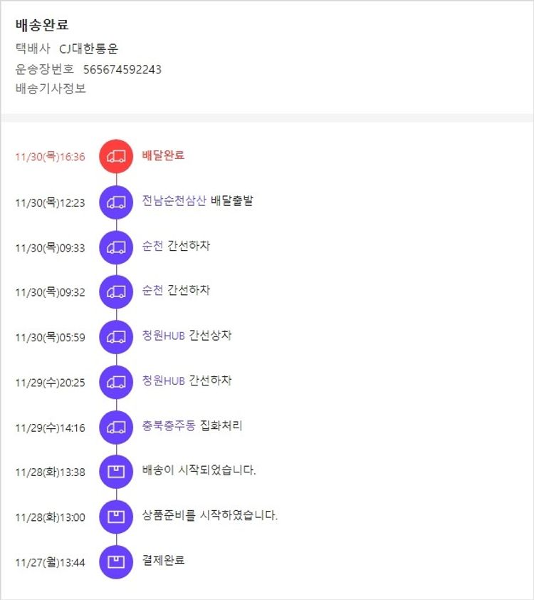 기부자님이 사용한 기부포인트 20,100원, 가격상승분 812원, 100원 미만 지원금 76원, 결제 수수료 9,114원, 기타 사업비는 행복나눔재단이 부담했습니다. (기부후기 발송시점에 최종 업데이트 됩니다.) 실제 쇼핑몰에서 확인되는 배송현황을 캡처한 내용입니다. 실시간 자료와는 차이가 있을 수 있습니다.