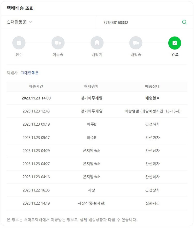 기부자님이 사용한 기부포인트 3,000원, 가격상승분 660원, 100원 미만 지원금 80원, 결제 수수료 11,995원, 기타 사업비는 행복나눔재단이 부담했습니다. (기부후기 발송시점에 최종 업데이트 됩니다.) 실제 쇼핑몰에서 확인되는 배송현황을 캡처한 내용입니다. 실시간 자료와는 차이가 있을 수 있습니다.