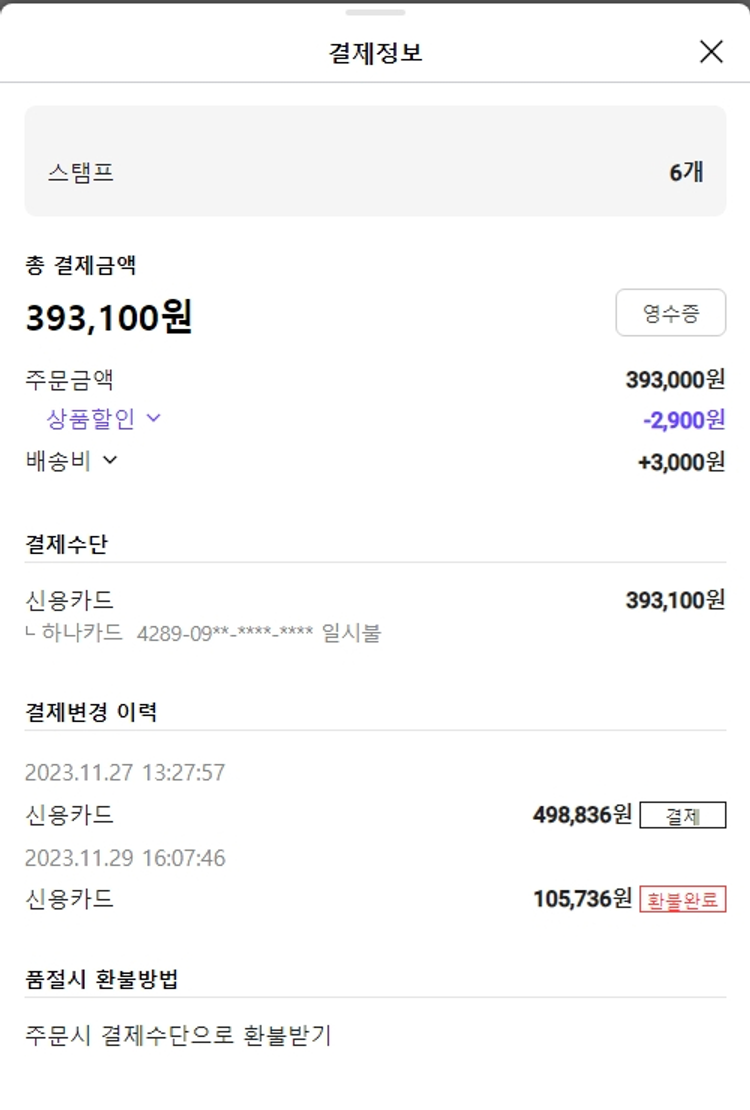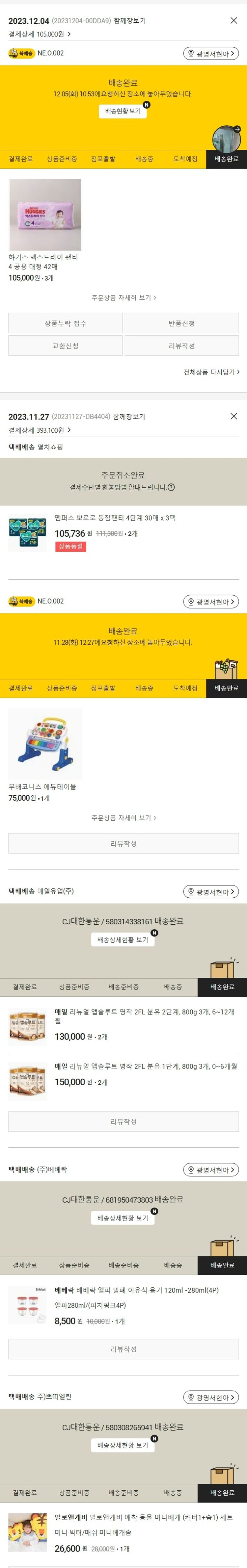 기부자님이 사용한 기부포인트 7,000원, 물품배송비 3,000원, 가격상승분 3,964원, 100원 미만 지원금 36원, 결제 수수료 9,253원, 기타 사업비는 행복나눔재단이 부담했습니다. (기부후기 발송시점에 최종 업데이트 됩니다.) 주문 건 중 품절 건 발생하여 2023. 12. 04. 재주문했습니다. 실제 쇼핑몰에서 확인되는 배송현황을 캡처한 내용입니다. 실시간 자료와는 차이가 있을 수 있습니다.