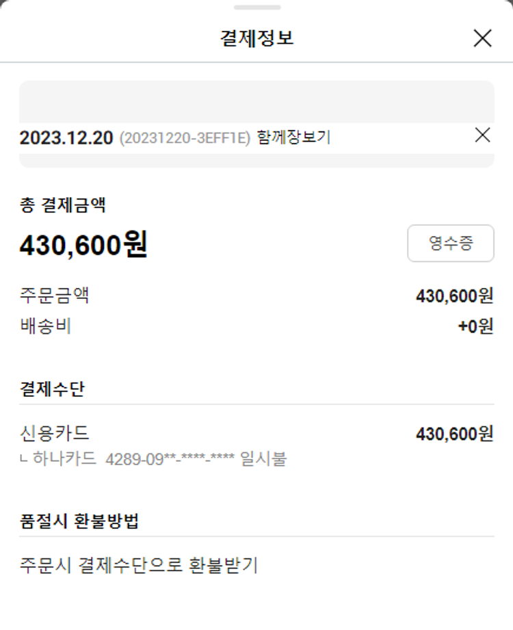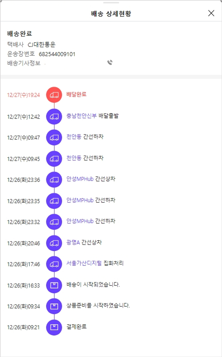 가격상승분 830원, 100원 미만 지원금 90원, 기타 사업비는 행복나눔재단이 부담했습니다. (기부후기 발송시점에 최종 업데이트 됩니다.) 주문 건 중 품절 건 발생하여 2023. 12. 26. 재주문했습니다. 실제 쇼핑몰에서 확인되는 배송현황을 캡처한 내용입니다. 실시간 자료와는 차이가 있을 수 있습니다.
