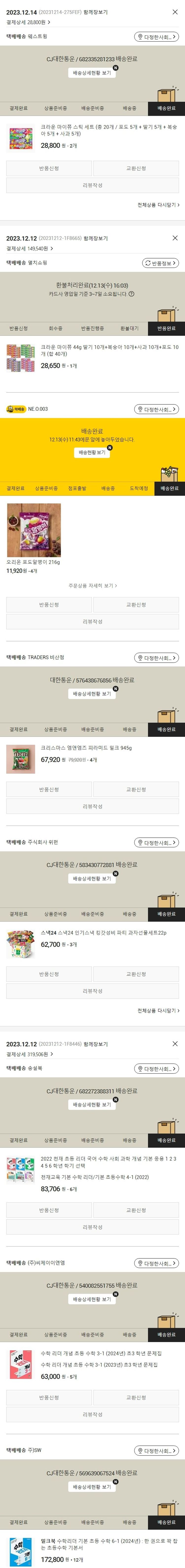 기부자님이 사용한 기부포인트 53,000원, 물품배송비 7,000원, 가격상승분 150원, 100원 미만 지원금 96원, 결제 수수료 11,101원, 기타 사업비는 행복나눔재단이 부담했습니다. (기부후기 발송시점에 최종 업데이트 됩니다.) 주문 건 중 품절 건 발생하여 2023. 12. 14. 재주문했습니다. 실제 쇼핑몰에서 확인되는 배송현황을 캡처한 내용입니다. 실시간 자료와는 차이가 있을 수 있습니다.