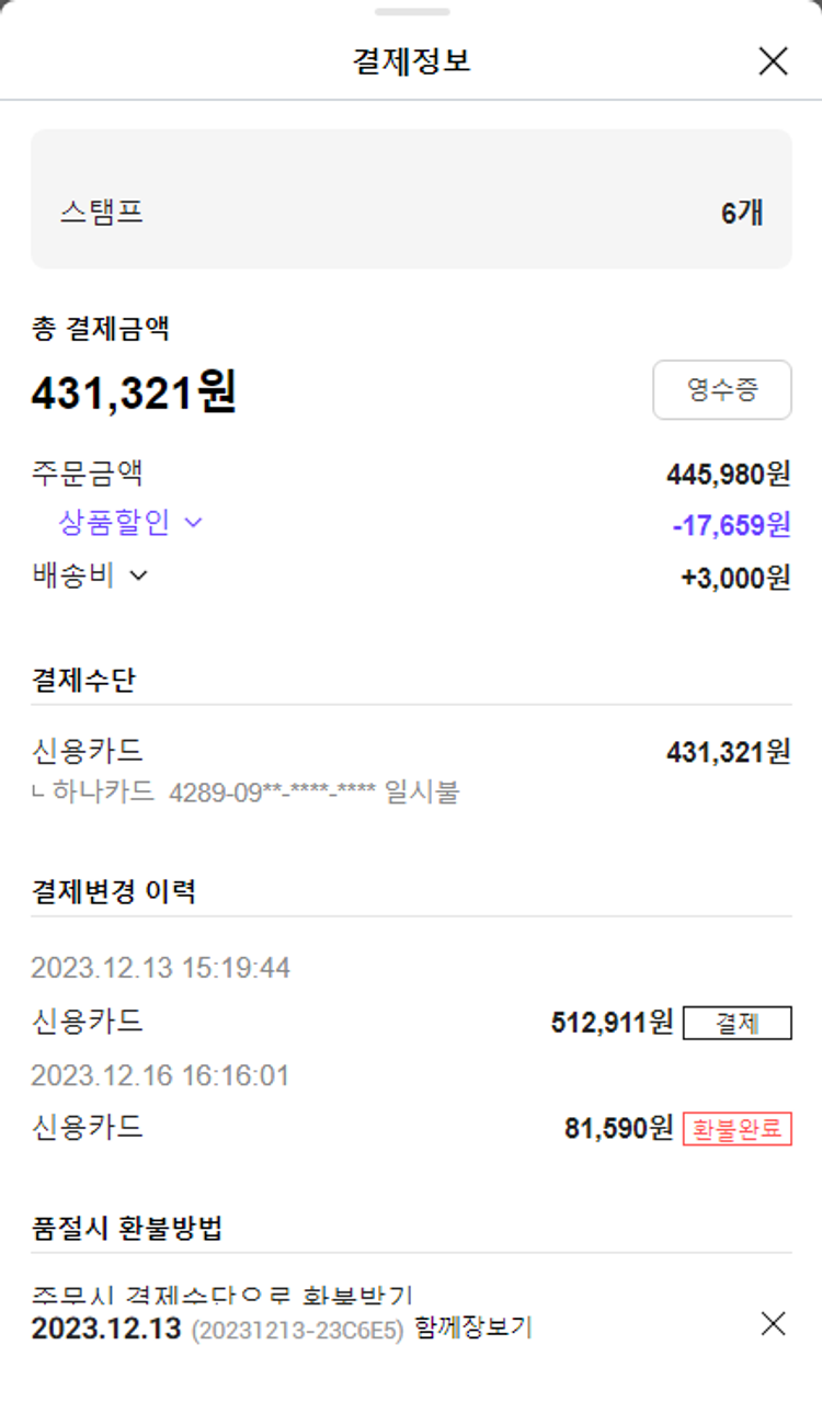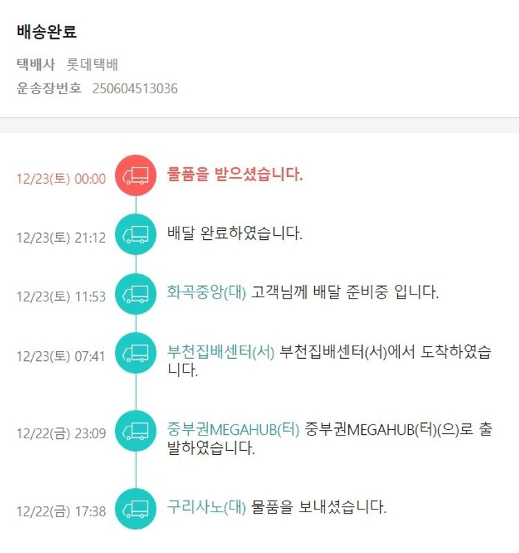 기부자님이 사용한 기부포인트 20,000원, 물품배송비 6,500원, 가격상승분 53원, 100원 미만 지원금 58원, 결제 수수료 10,659원, 기타 사업비는 행복나눔재단이 부담했습니다. (기부후기 발송시점에 최종 업데이트 됩니다.) 주문 건 중 품절 건 발생하여 2023. 12. 21. 재주문했습니다. 실제 쇼핑몰에서 확인되는 배송현황을 캡처한 내용입니다. 실시간 자료와는 차이가 있을 수 있습니다.