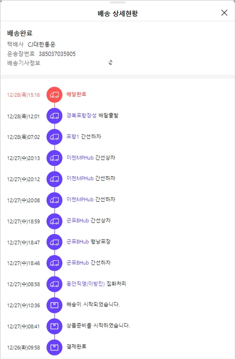 기부자님이 사용한 기부포인트 11,000원, 가격상승분 650원, 100원 미만 지원금 30원, 결제 수수료 9,677원, 기타 사업비는 행복나눔재단이 부담했습니다. (기부후기 발송시점에 최종 업데이트 됩니다.) 실제 쇼핑몰에서 확인되는 배송현황을 캡처한 내용입니다. 실시간 자료와는 차이가 있을 수 있습니다.