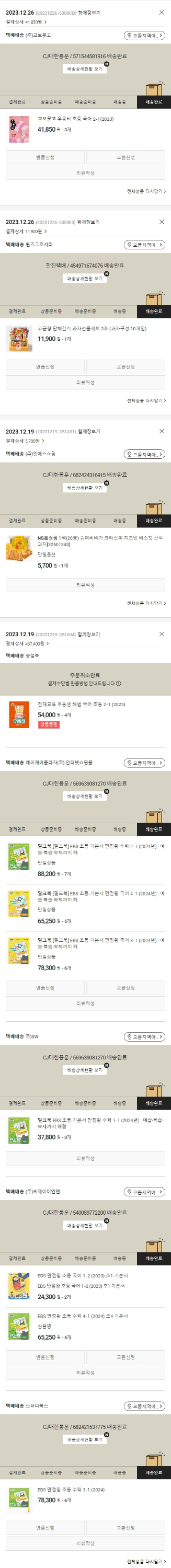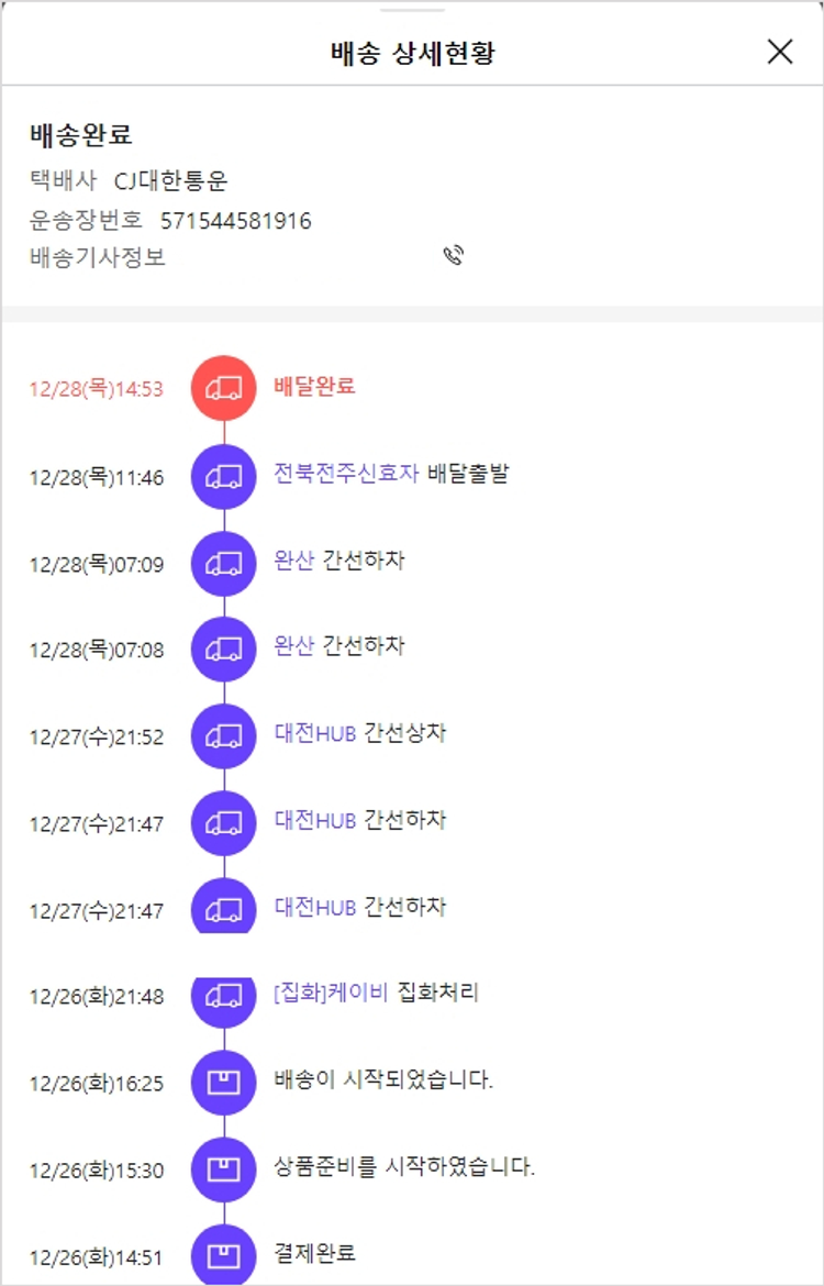 기부자님이 사용한 기부포인트 26,100원, 가격상승분 43원, 100원 미만 지원금 7원, 결제 수수료 10,086원, 기타 사업비는 행복나눔재단이 부담했습니다. (기부후기 발송시점에 최종 업데이트 됩니다.) 주문 건 중 품절 건 발생하여 2023. 12. 26. 재주문했습니다. 실제 쇼핑몰에서 확인되는 배송현황을 캡처한 내용입니다. 실시간 자료와는 차이가 있을 수 있습니다.