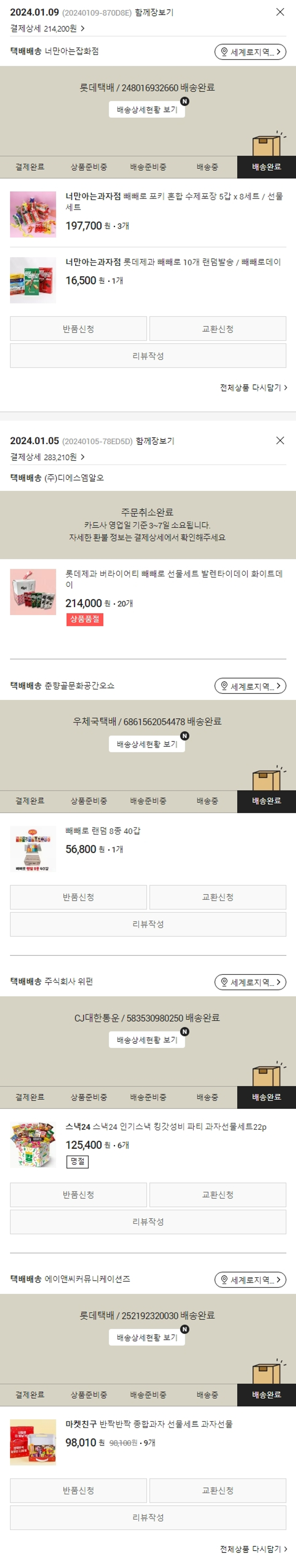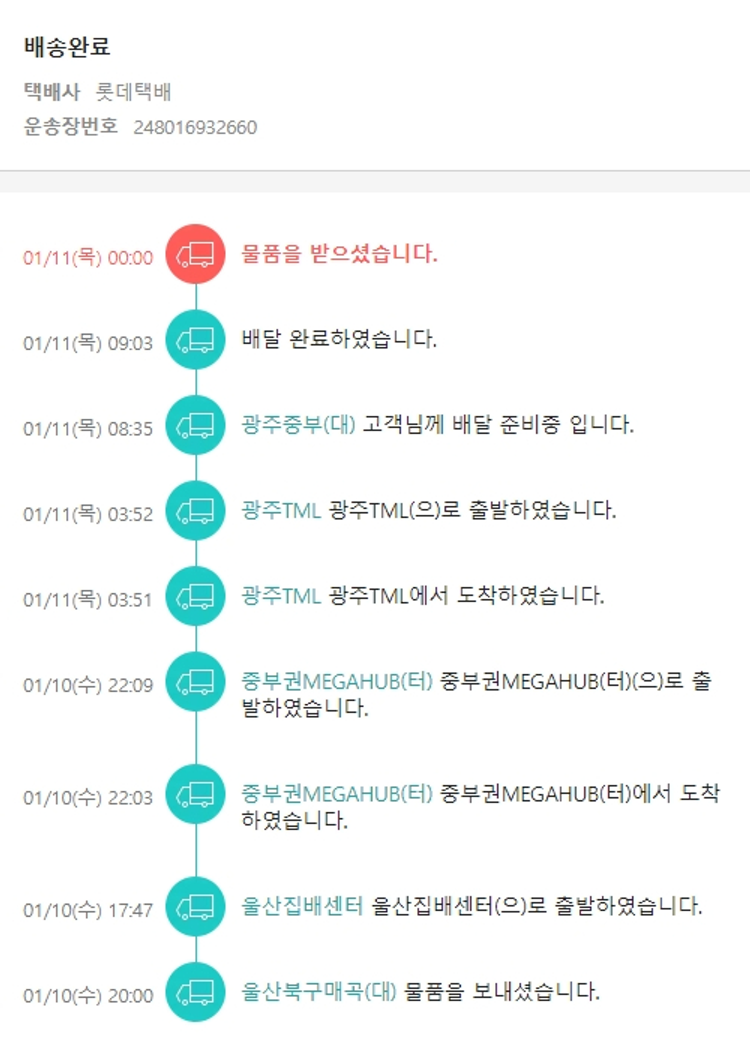 기부자님이 사용한 기부포인트 10,000원, 물품배송비 3,000원, 가격상승분 200원, 100원 미만 지원금 10원, 결제 수수료 11,327원, 기타 사업비는 행복나눔재단이 부담했습니다. (기부후기 발송시점에 최종 업데이트 됩니다.) 주문 건 중 품절 건 발생하여 2024. 01. 09. 재주문했습니다. 실제 쇼핑몰에서 확인되는 배송현황을 캡처한 내용입니다. 실시간 자료와는 차이가 있을 수 있습니다.