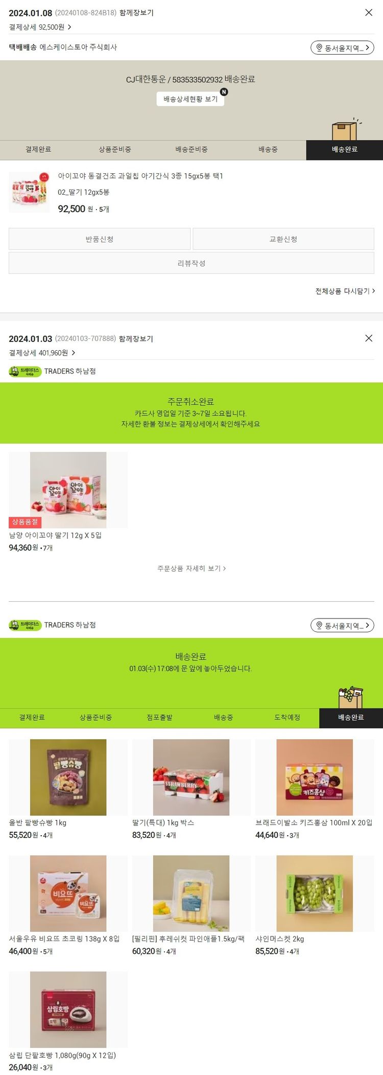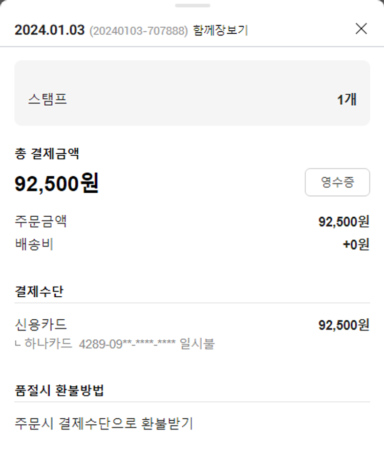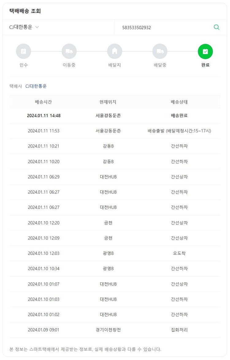 기부자님이 사용한 기부포인트 44,000원, 가격상승분 141원, 100원 미만 지원금 19원, 결제 수수료 10,413원, 기타 사업비는 행복나눔재단이 부담했습니다. (기부후기 발송시점에 최종 업데이트 됩니다.) 주문 건 중 품절 건 발생하여 2024. 01. 08. 재주문했습니다. 실제 쇼핑몰에서 확인되는 배송현황을 캡처한 내용입니다. 실시간 자료와는 차이가 있을 수 있습니다.