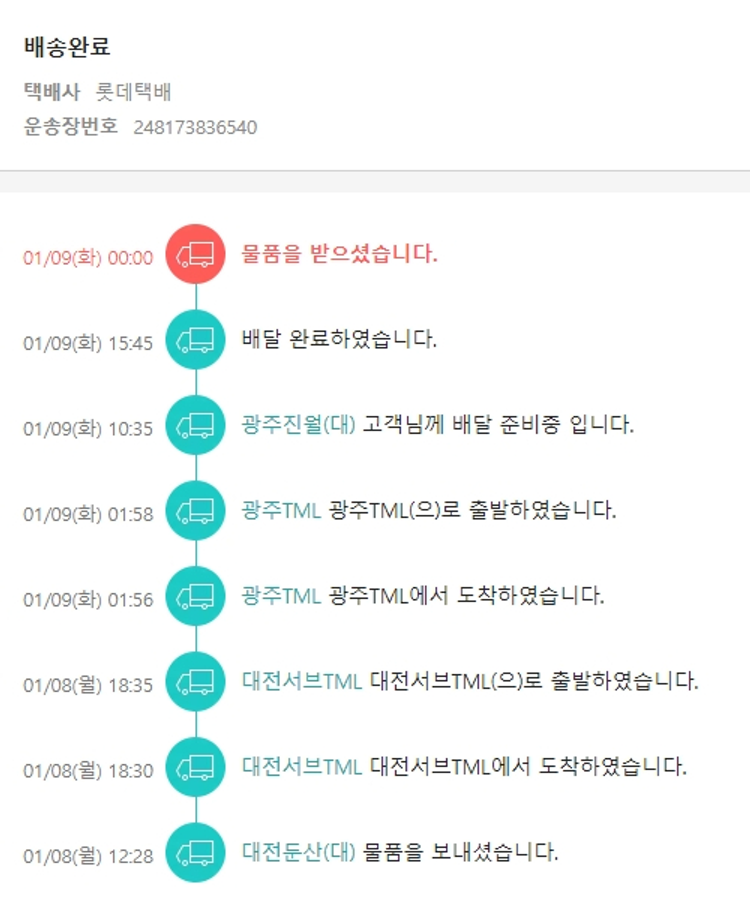 가격상승분 176원, 100원 미만 지원금 72원, 결제 수수료 13,849원, 기타 사업비는 행복나눔재단이 부담했습니다. (기부후기 발송시점에 최종 업데이트 됩니다.) 주문 건 중 품절 건 발생하여 2024. 01. 08. 재주문했습니다. 실제 쇼핑몰에서 확인되는 배송현황을 캡처한 내용입니다. 실시간 자료와는 차이가 있을 수 있습니다.