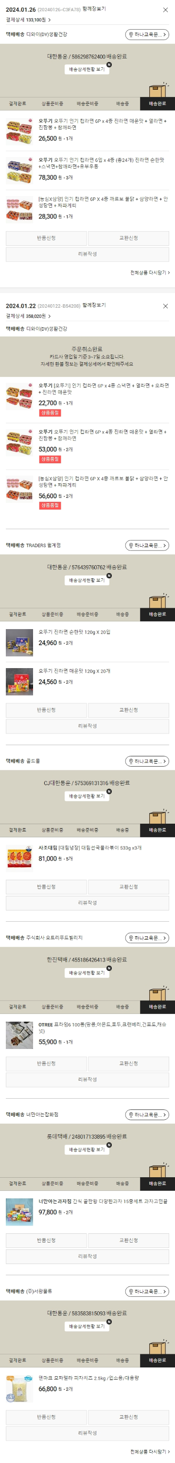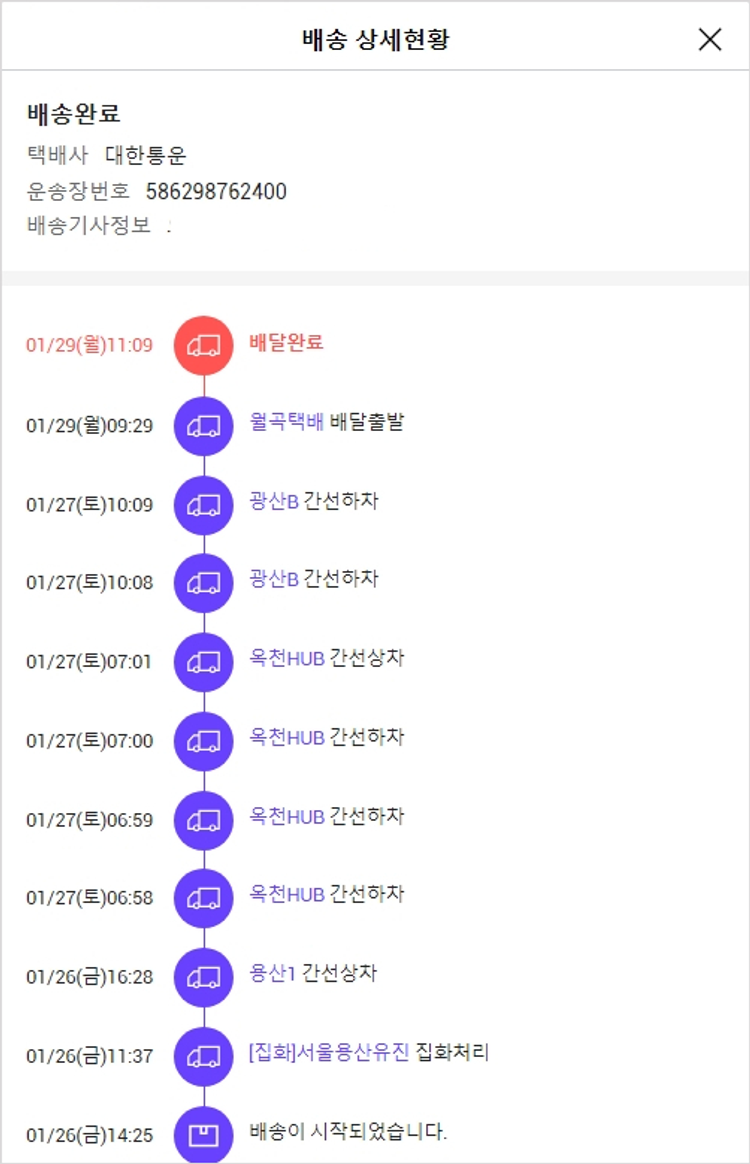 기부자님이 사용한 기부포인트 3,700원, 물품배송비 7,000원, 가격상승분 1,700원, 100원 미만 지원금 20원, 결제 수수료 9,826원, 기타 사업비는 행복나눔재단이 부담했습니다. (기부후기 발송시점에 최종 업데이트 됩니다.) 주문 건 중 품절 건 발생하여 2024. 01. 26. 재주문했습니다. 실제 쇼핑몰에서 확인되는 배송현황을 캡처한 내용입니다. 실시간 자료와는 차이가 있을 수 있습니다.