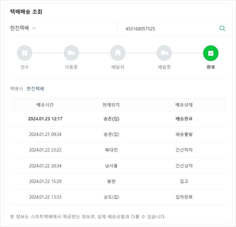 기부자님이 사용한 기부포인트 16,100원, 가격상승분 500원, 100원 미만 지원금 76원, 결제 수수료 8,852원, 기타 사업비는 행복나눔재단이 부담했습니다. (기부후기 발송시점에 최종 업데이트 됩니다.) 주문 건 중 품절 건 발생하여 2024. 01. 19. 재주문했습니다. 실제 쇼핑몰에서 확인되는 배송현황을 캡처한 내용입니다. 실시간 자료와는 차이가 있을 수 있습니다.