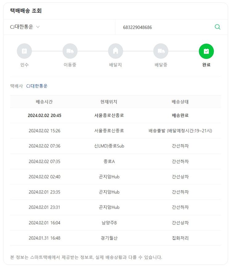 기부자님이 사용한 기부포인트 5,500원, 물품배송비 13,500원, 가격상승분 240원, 100원 미만 지원금 90원, 결제 수수료 14,919원, 기타 사업비는 행복나눔재단이 부담했습니다. (기부후기 발송시점에 최종 업데이트 됩니다.) 주문 건 중 품절 건 발생하여 2024. 01. 30. 재주문했습니다. 실제 쇼핑몰에서 확인되는 배송현황을 캡처한 내용입니다. 실시간 자료와는 차이가 있을 수 있습니다.