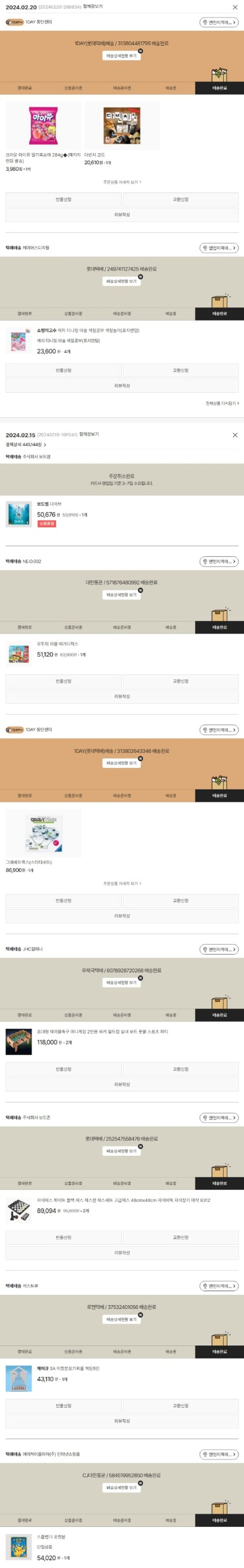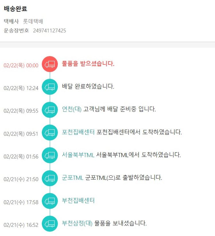 기부자님이 사용한 기부포인트 48,850원, 물품배송비 5,900원, 가격상승분 214원, 100원 미만 지원금 20원, 결제 수수료 10,397원, 기타 사업비는 행복나눔재단이 부담했습니다. (기부후기 발송시점에 최종 업데이트 됩니다.) 주문 건 중 품절 건 발생하여 2024. 02. 20. 재주문했습니다. 실제 쇼핑몰에서 확인되는 배송현황을 캡처한 내용입니다. 실시간 자료와는 차이가 있을 수 있습니다.