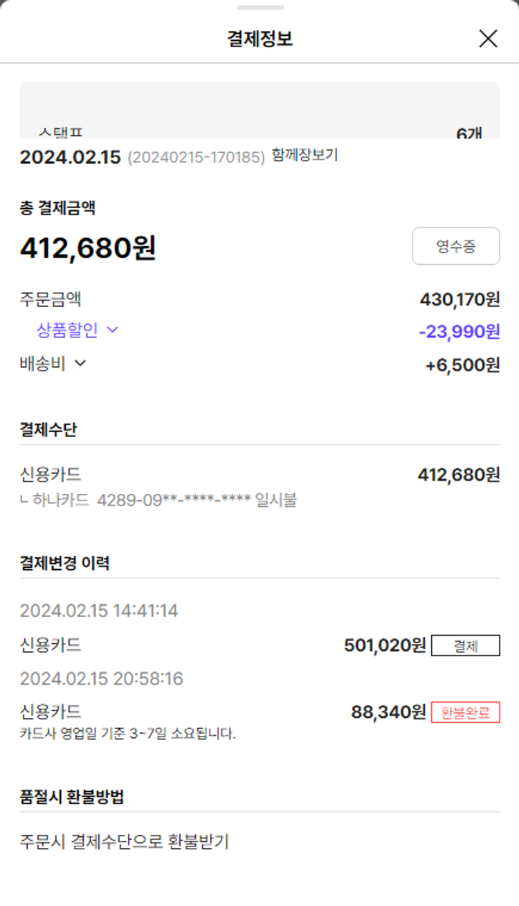 기부자님이 사용한 기부포인트 15,950원, 물품배송비 9,500원, 가격상승분 1,623원, 100원 미만 지원금 76원, 결제 수수료 10,288원, 기타 사업비는 행복나눔재단이 부담했습니다. (기부후기 발송시점에 최종 업데이트 됩니다.) 주문 건 중 품절 건 발생하여 2024. 02. 20. 재주문했습니다. 실제 쇼핑몰에서 확인되는 배송현황을 캡처한 내용입니다. 실시간 자료와는 차이가 있을 수 있습니다.