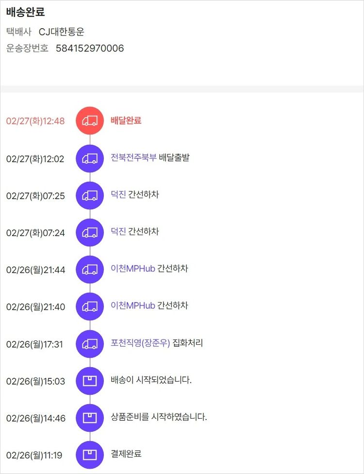 기부자님이 사용한 기부포인트 21,500원, 가격상승분 7,130원, 100원 미만 지원금 40원, 결제 수수료 8,909원, 기타 사업비는 행복나눔재단이 부담했습니다. (기부후기 발송시점에 최종 업데이트 됩니다.) 실제 쇼핑몰에서 확인되는 배송현황을 캡처한 내용입니다. 실시간 자료와는 차이가 있을 수 있습니다.