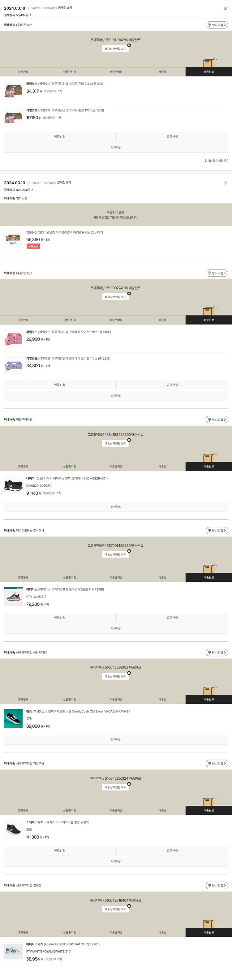 기부자님이 사용한 기부포인트 5,500원, 물품배송비 3,000원, 가격상승분 37원, 100원 미만 지원금 54원, 결제 수수료 11,989원, 기타 사업비는 행복나눔재단이 부담했습니다. (기부후기 발송시점에 최종 업데이트 됩니다.) 주문 건 중 품절 건 발생하여 2024. 03. 18. 재주문했습니다. 실제 쇼핑몰에서 확인되는 배송현황을 캡처한 내용입니다. 실시간 자료와는 차이가 있을 수 있습니다.